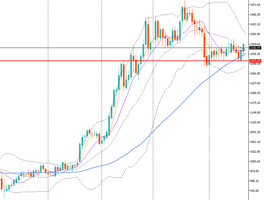 铂金大幅反弹,5日、10日均线一线阻力,如彻底升破,可看多至1380,1400附近。