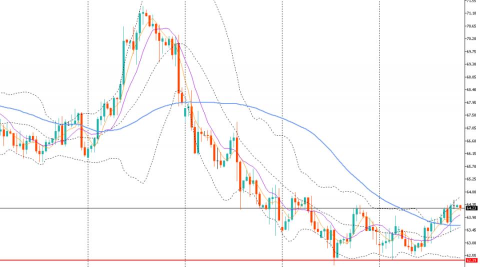美原油延续反弹,升破10日均线,日线小时呈多重底,多单仍可持有,如站上64,可继续上看至66。