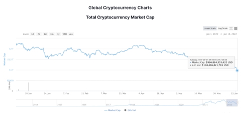 在比特币和以太坊领跌之外,除了部分稳定币,体量前十的加密币种近7日的跌幅均超过20%。加密货币市场体量缩水。据CoinMarketCap统计,截至UTC时间6月14日8时,加密货币市场总市值为9449亿美元,不足万亿美元。