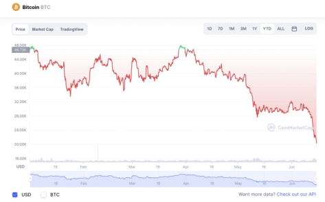 2022年开年,比特币价格尚在47000美元上方,一季度最低价格在31000美元左右。自4月起,比特币震荡下行,并在5月告别4万美元关口,一路跌破3万美元。以太坊同样经历震荡,并在5月接连跌破3000美元和2000美元关口,6月10日起,以太坊价格也一路直线走跌。