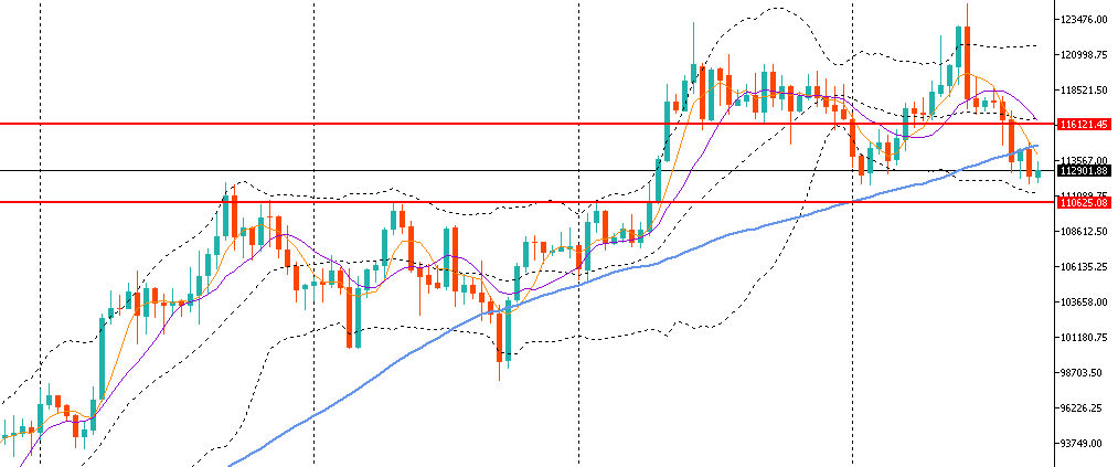 比特币日线呈空方炮,一度刺破关键支撑112000,日线RSI到达低位,如无法重新站上116000,短线一线。