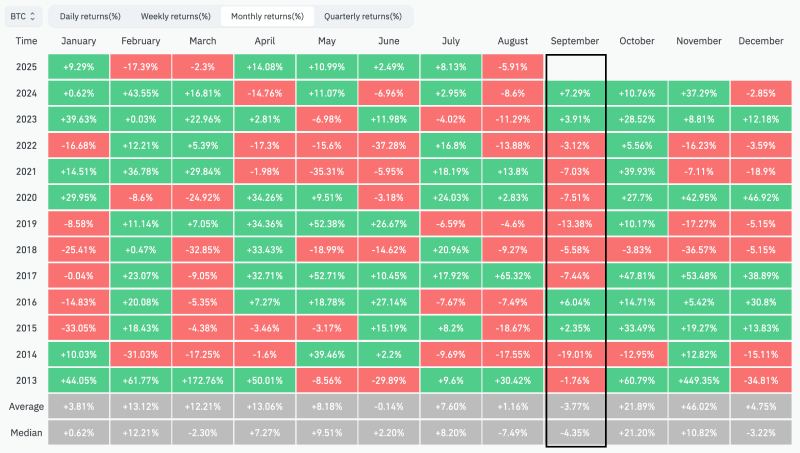 自2013年以来,比特币在过去12个9月中有8次收跌,平均回报率约为-3.80%。