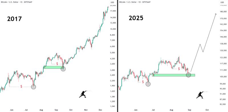 对比2017年与2025年的走势图,可以发现两者走势几乎如出一辙。在这两个周期中,比特币均在8月末大幅下挫,随后在关键支撑区企稳并强势反弹。