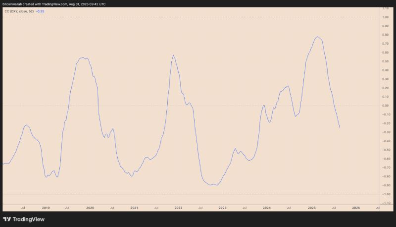 截至周日,比特币与美元指数(DXY)的52周相关系数已降至-0.25,创下两年来最低水平。