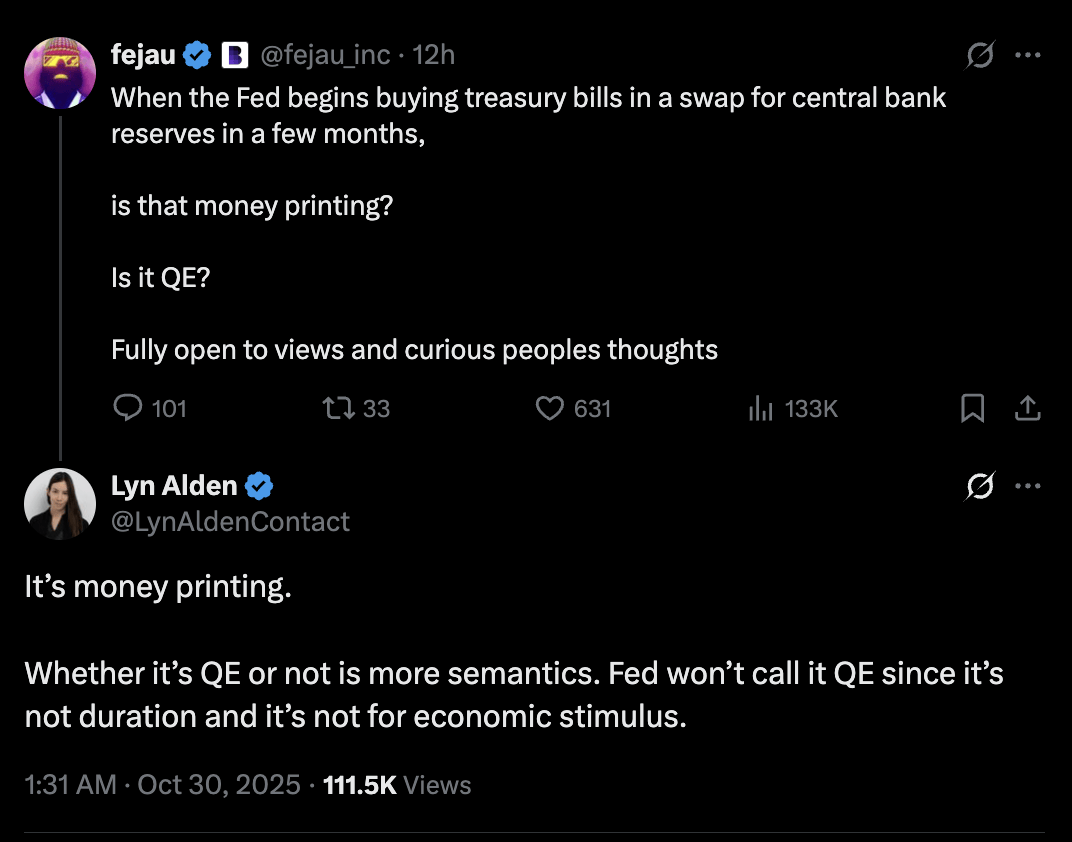 经济学家Lyn Alden表示,美联储决定将到期债务重新投资于国库券实际上创造了新资金,即使该机构避免称其为QE。