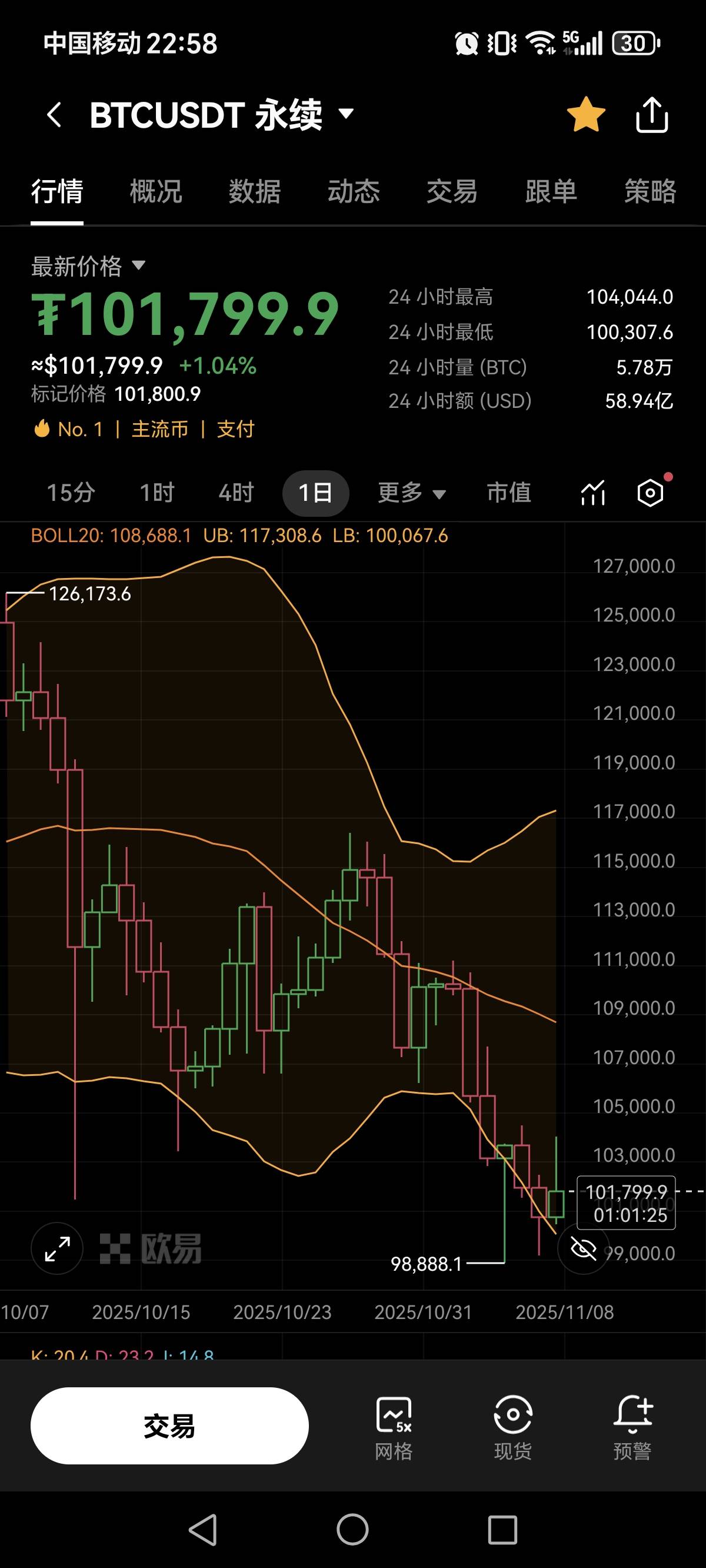 比特币早间反弹至104058一线后承压回落,目前价格在102000附近震荡运行。从4小时图来看,此前探高回落收低,本周延续回落态势,成功跌破十万一带平台支撑低点,市场格局由此转为震荡弱势下行。昨日反弹至中轨位置时出现停顿并承压震荡,尾盘始终维持在该位置之下进行弱势整理。长时间横盘且未出现放量情况,随后再次下行,这充分表明当前4小时级别依旧处于弱势下行延续阶段。布林带指标显示,轨道呈现收窄趋势,预示着市场波动率有所降低,但这种盘整状态往往暗示着即将出现突破性行情。MACD指标维持死叉向下态势,快线(DIF)与慢线(DEA)开口持续扩大,柱状图(MACD)在零轴下方不断延伸,这表明空头力量仍占据主导地位,市场做空动能尚未充分释放。