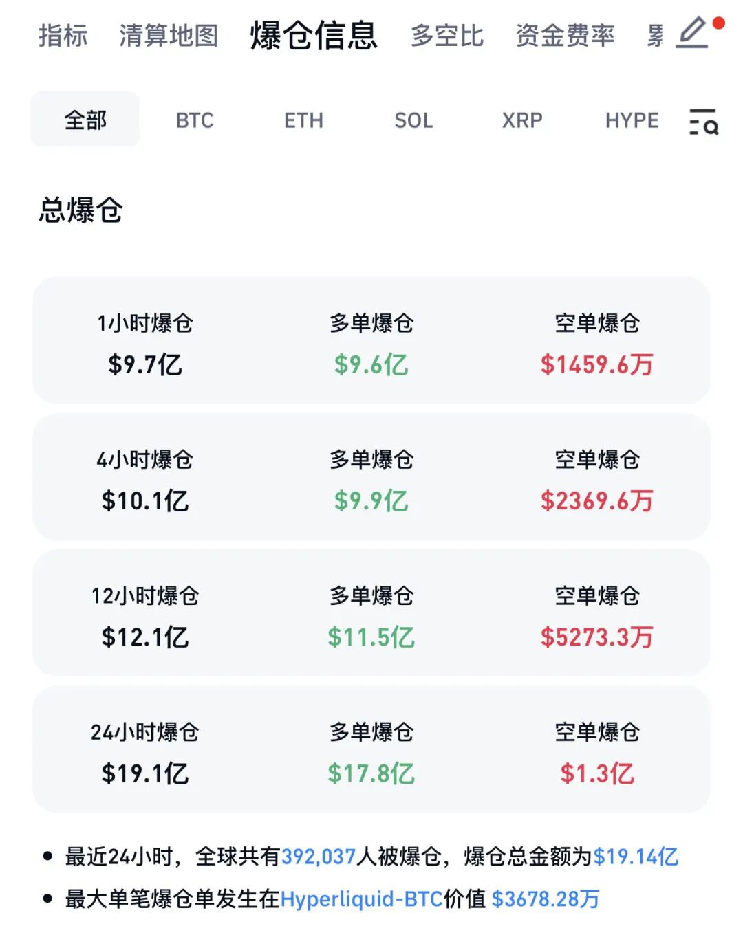 Coinglass数据显示,过去的24小时内,加密货币全网合约爆仓19.14亿美元,爆仓人数达到39.2万人。其中,多单爆仓17.8亿美元,空单爆仓1.3亿美元。最大单笔爆仓单发生在Hyperliquid-BTC,价值3678.28万美元。