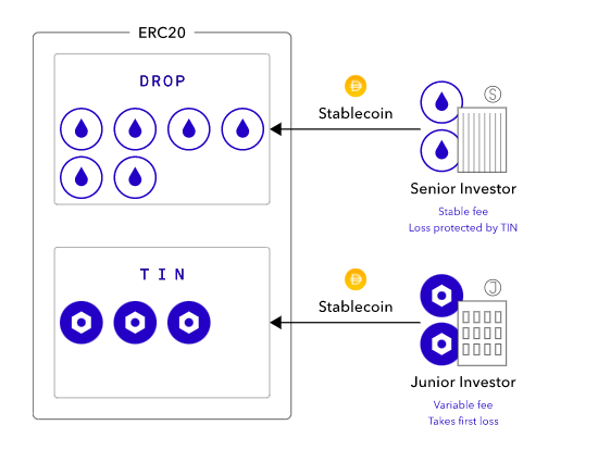 Drop 代币类似传统金融投资组合中的高级债券,收益较小,一般是固定的,风险较小;Tin 代币类似初级债券,收益虽高,但其首先承担违约风险,并且只有 Drop 代币全部被赎回时,Tin 代币才能获得投资回报,风险更大,可能亏损本金。