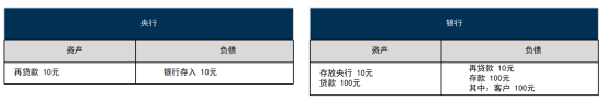 现有银行实施的是部分准备金制度,也就是监管部门要求银行按存款基数缴纳一定比例(不到100%)的存款准备金。假设法定存款准备金率是10%,那么一个简化的央行——银行体系的资产负债表如下所示。