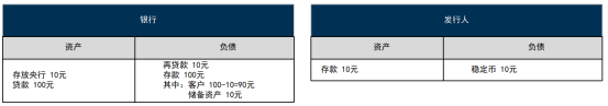 假设有一家稳定币发行机构来提供稳定币发行服务,而有客户希望使用稳定币,于是客户向稳定币发行人支付10元用于购买稳定币,稳定币发行人向该客户发行10元的稳定币,同时将收到的10元法币储备在银行账户中,形成储备资产(存款)。完成稳定币发行之后,银行的总存款没有变化,只是存款人发生变化。而客户从原来的持有100元法币变成了持有90元法币和10元稳定币。