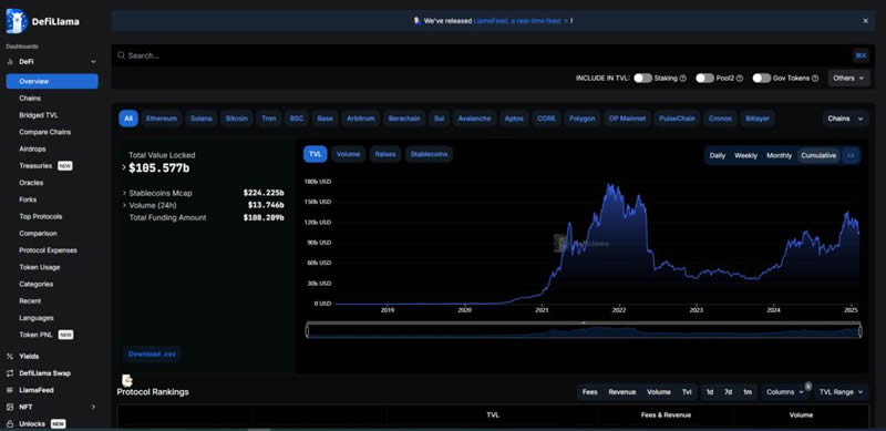 对于查看DeFi 项目的平台,可以使用DeFiLlama,该平台有整理跟归纳不同链上的去中心化交易所,并且提供连结,让玩家可以分别查询不同的交互方式可获得的收益,并且比较不同平台的收益率。