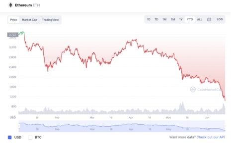 2022年开年,比特币价格尚在47000美元上方,一季度最低价格在31000美元左右。自4月起,比特币震荡下行,并在5月告别4万美元关口,一路跌破3万美元。以太坊同样经历震荡,并在5月接连跌破3000美元和2000美元关口,6月10日起,以太坊价格也一路直线走跌。