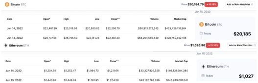 当日,比特币和以太坊的单日下行震幅均超过15%。截至6月15日,比特币和以太坊连日下跌,价格分别逼近2万美元和1000美元关口,较2021年11月创下的历史高位68700美元和4890美元分别跌去70%和79%。