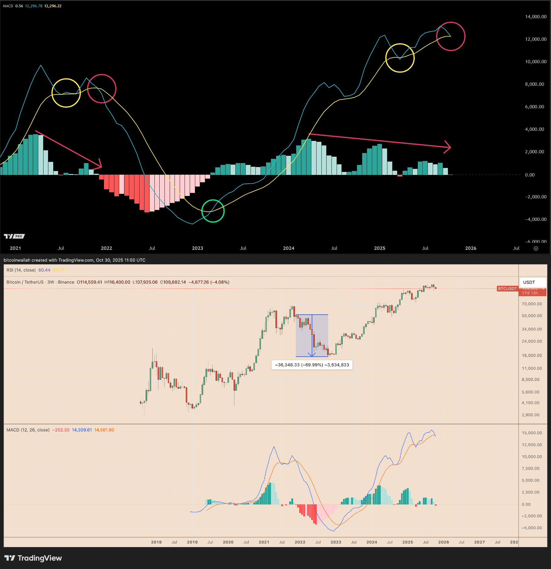 与此同时,一些潜在熊市开始的迹象正在被注意到。分析师Jesse Olson指出比特币三周图上的“即将出现的看跌MACD交叉”,这是2021-2022年市场回调69%之前的技术信号。