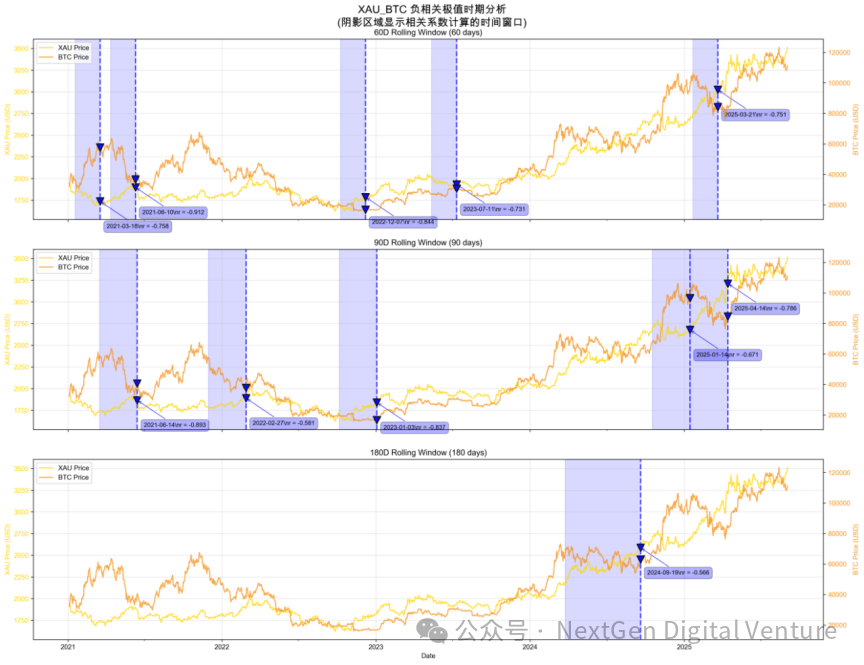 黄金强、BTC 弱:2021 年春夏:黄金因通胀担忧走强,比特币因中国监管与马斯克言论大跌; 2021 年底至2022 年初:地缘冲突推升黄金,但BTC 因美联储紧缩与科技股回调走弱; 2025 年一季度,贸易摩擦和中东冲突 → 黄金突破 3000 美元,而 BTC 则进入“利好兑现”后的高位回调。