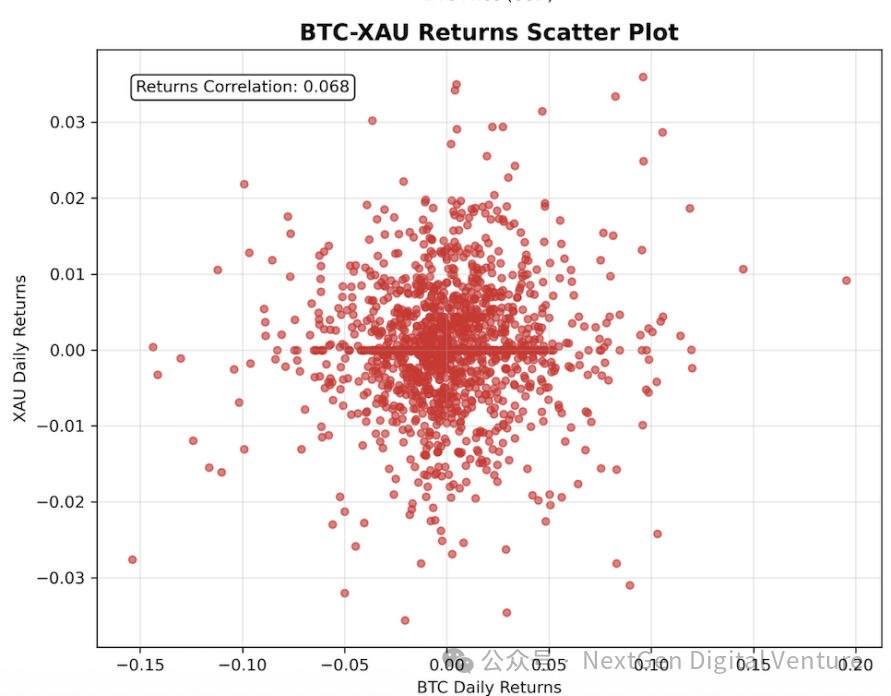 收益率相关性:统计检验显示 BTC 与黄金的日度收益率没有显著相关性。说明两者短期波动并不联动,BTC 的涨跌更多受自身市场事件驱动。